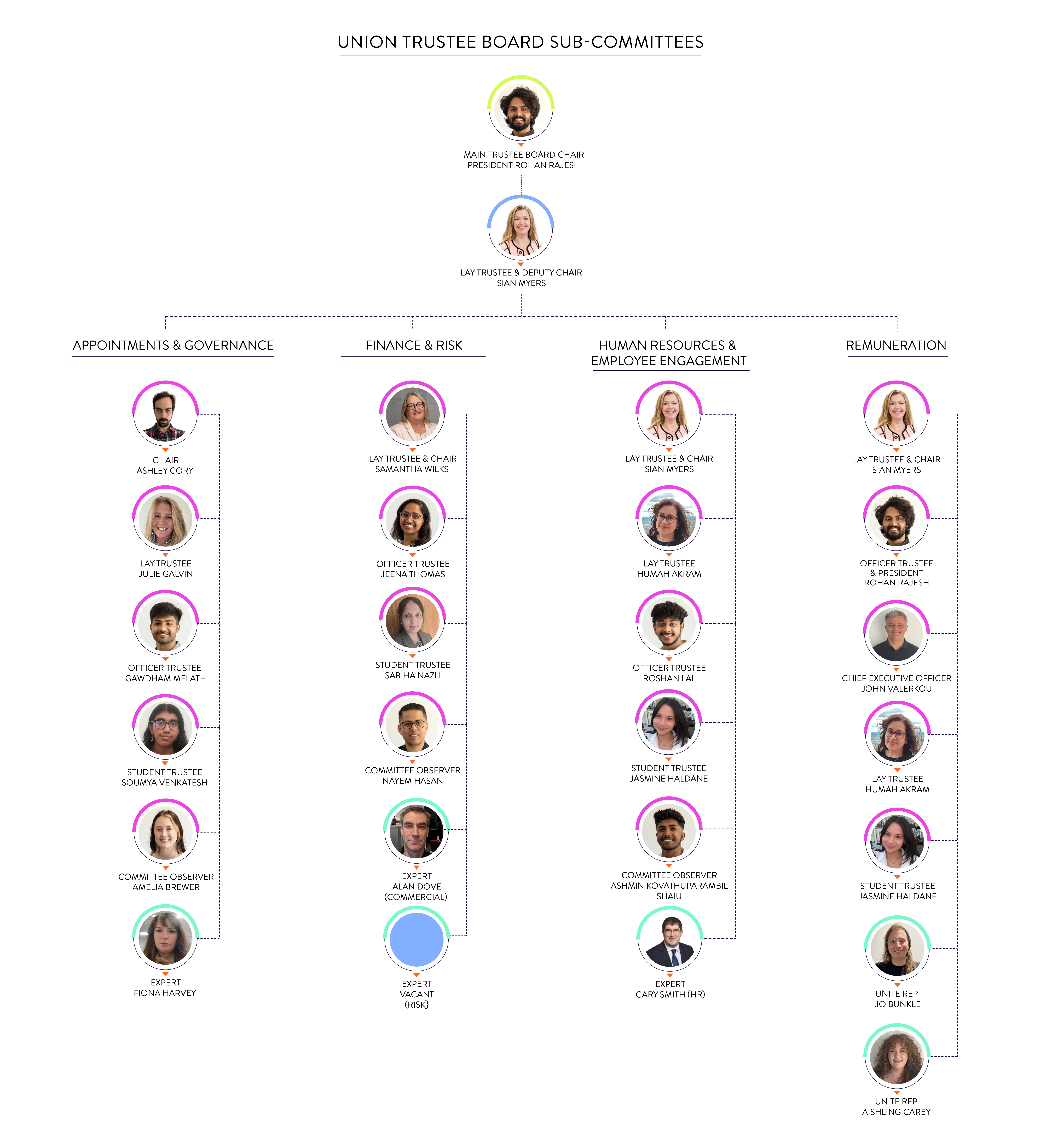 Our Union has a Board of Trustees made up of Student Trustees, External Trustees and the five Executive Officers.
